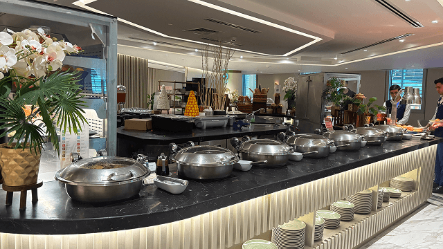 Pearl Lounge(パールラウンジ)の中央には料理が並べられ、座席は食事や作業に使いやすいシートが存在します。