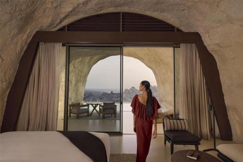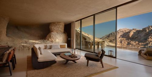 砂漠の中の、赤い岩山に囲まれたロケーションが特徴で、砂漠の景観と調和するデザインが魅力です。